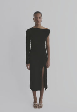 Our SOPHIA one-shoulder slinky knit dress is crafted from pure viscose selected for its fluid drape and exceptionally soft hand. Designed with an asymmetric neckline that gathers and folds elegantly across the shoulder, it skims the body with a sculpted, elongated silhouette. The high side slit lends ease of movement and a subtle, elevated sensuality.